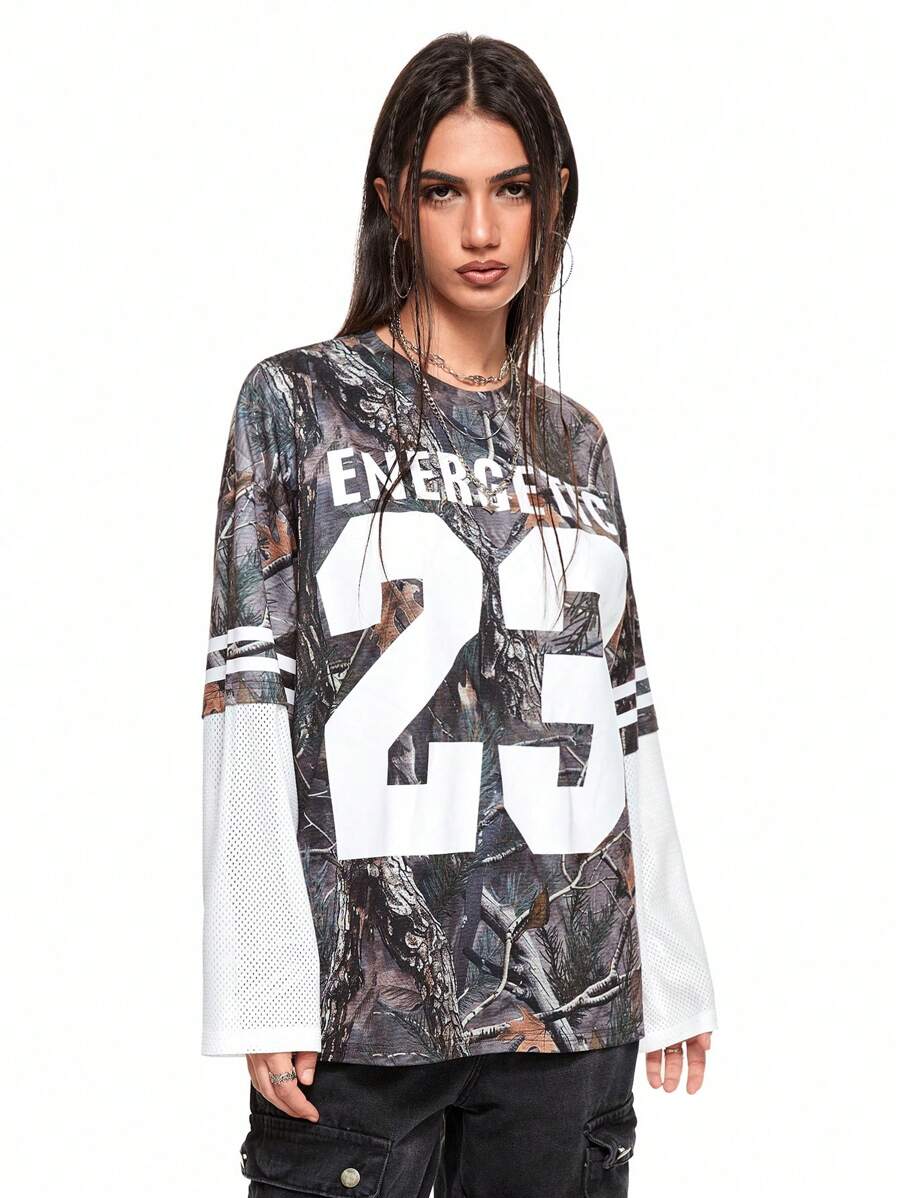 Street Life Camiseta holgada de manga larga para mujer, de estilo callejero y de tendencia, con estampado de números, eslogan y rayas en contraste de malla
