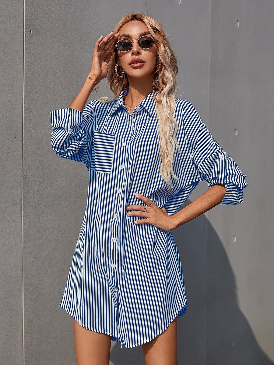 Vestido estilo camisa de manga de doblez de rayas