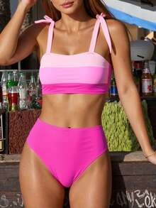 Bikini de bloques de color con hombros anudados, bikini de vacaciones