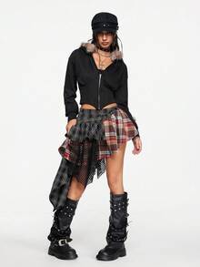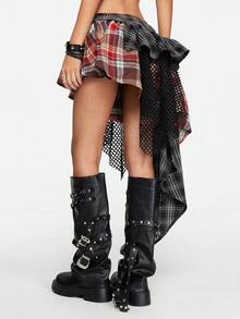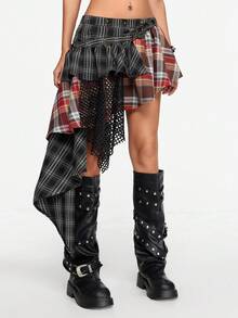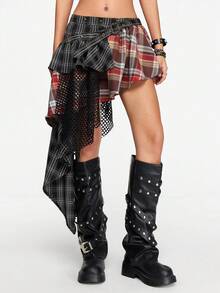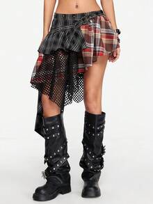 Grunge Punk Falda de mujer asimétrica de cintura baja, con parches, de estilo vintage Y2K, con remaches, strass, tirantes sin mangas, a cuadros, de encaje y malla, para conciertos, festivales, playa, graduación y verano