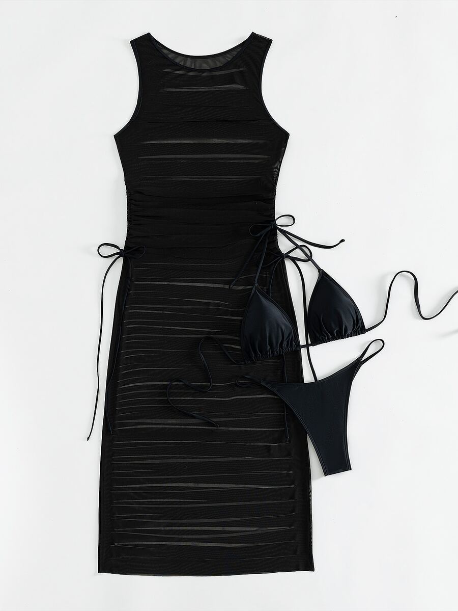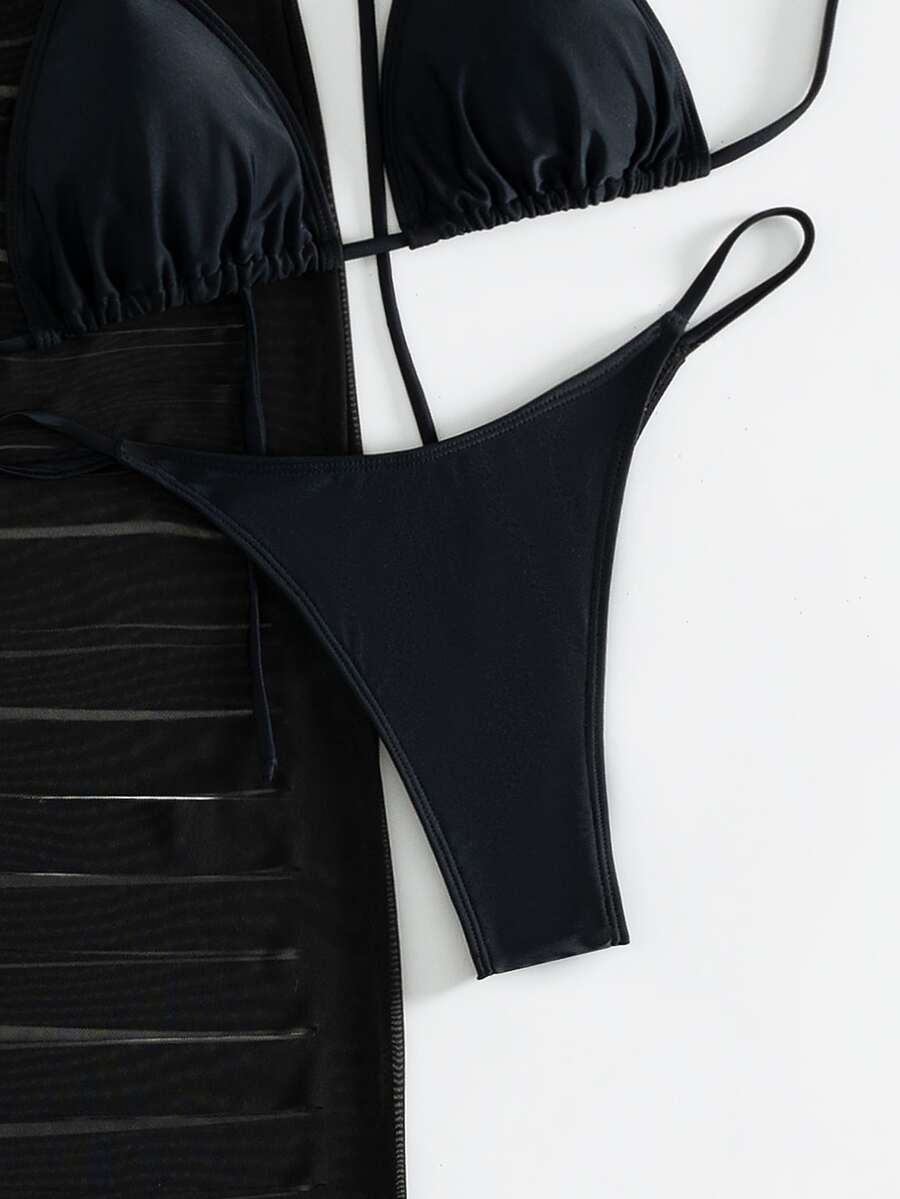 Conjunto de bikini unicolor, sujetador de triángulo halter y parte inferior de tanga y vestido desgastado para cubrir, traje de baño de 3 piezas