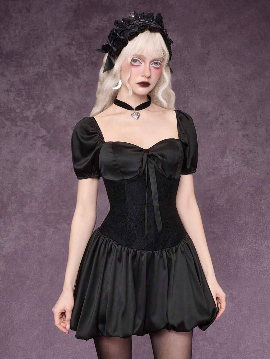 Goth Vestido mini con volantes, lazo y estilo gótico para mujer, ropa de verano