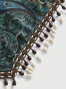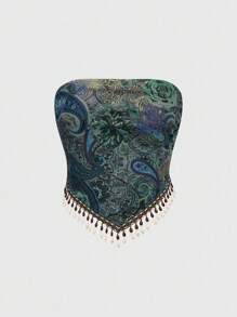 Top tubo bohemio con estampado de paisley, flecos con cuentas de madera transparentes y estilo hippie retro western para mujeres en festivales de música de verano