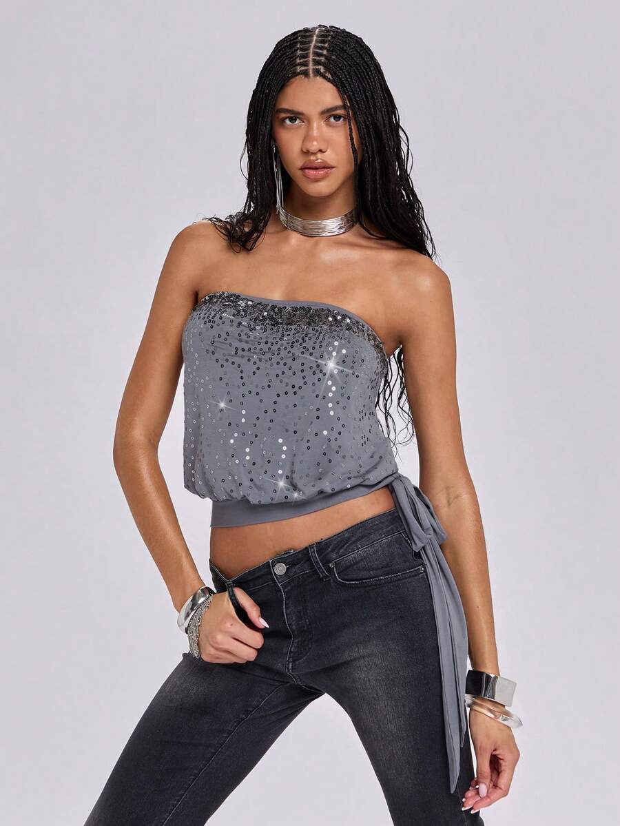 Y2K Top corto sexy con bordado de lentejuelas, cintura con cordón y abertura lateral, para mujer