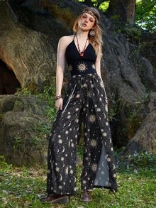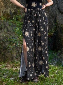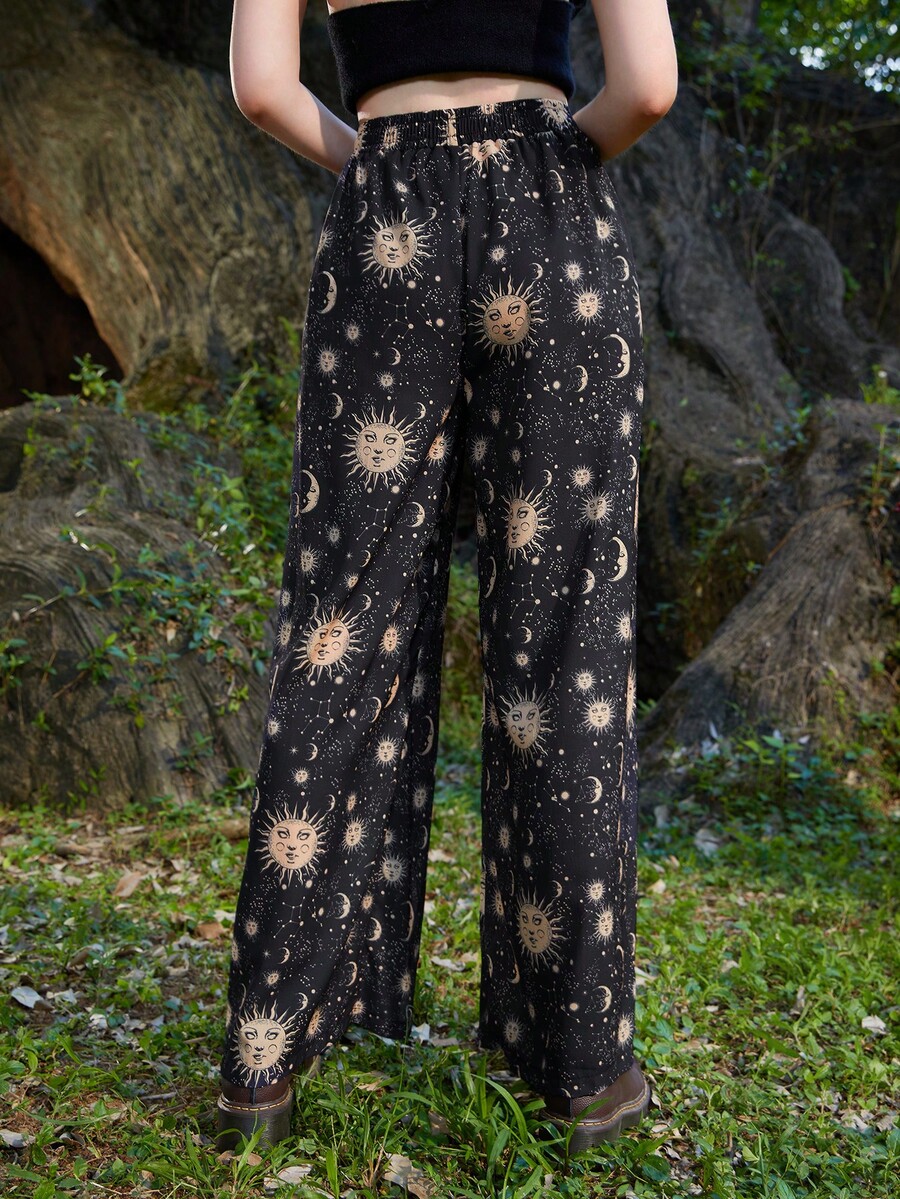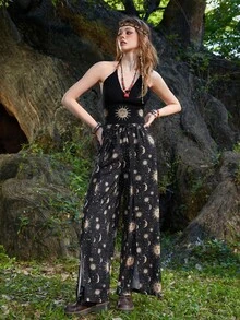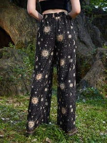 Heymoonly Pantalones de pierna ancha con estampado de sol y luna de cintura con nudo