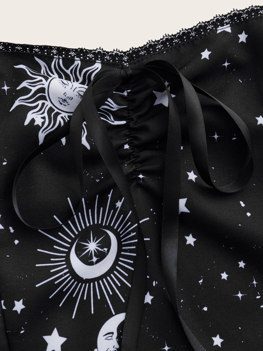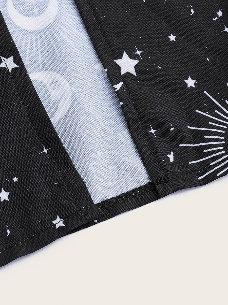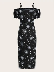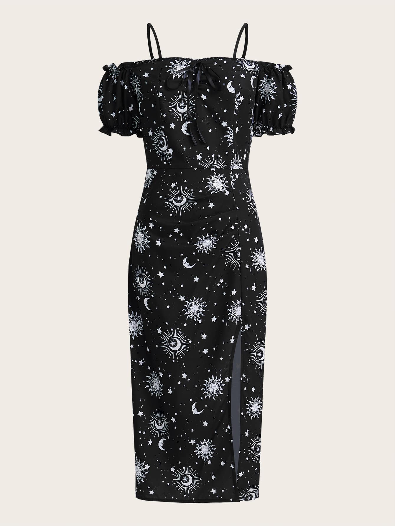 Vestido con estampado de sol y luna de hombros descubiertos de muslo con abertura