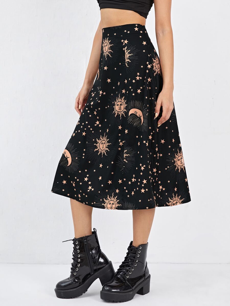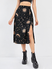 Falda con abertura con estampado de luna y sol