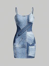 Grunge Punk Vestido mini ajustado de camisola con estampado retro grunge de tela con efecto de mezclilla sintética para mujeres