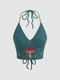 Goth Blusa de punto con escote halter bordada con castillo gótico para mujer