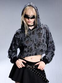 Grunge Punk Sudadera con capucha de estilo callejero suelto, rasgada, desgastada y transparente con cordón para mujeres