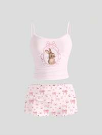 Kawaii Conjunto de 2 piezas de camiseta de tirantes con lazo de conejo inocente y shorts sexys de estilo colegial primaveral/veraniego para mujer