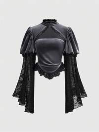 Goth Blusa con contraste de encaje, manga acampanada y estilo gótico romántico de terciopelo para mujeres