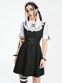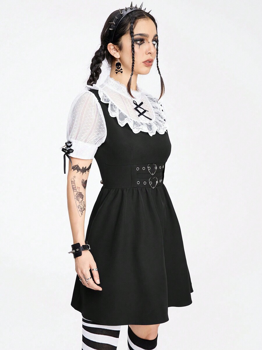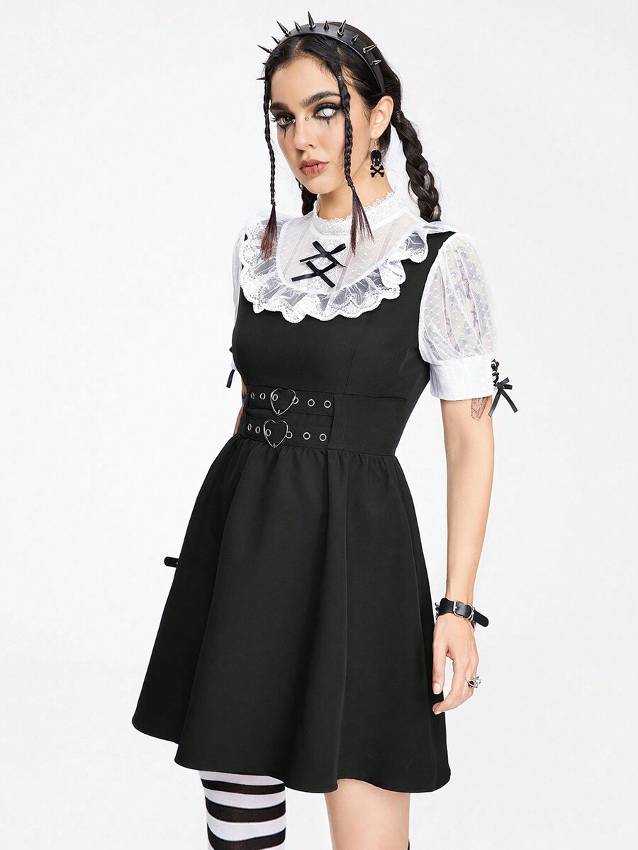 Goth Vestido dulce de estilo gótico con capas de encaje y ribete de volantes en bloque de color, detalles de lazo y hebilla con forma de corazón, diseño de cintura ajustada para mujeres