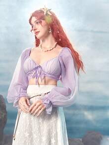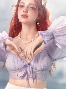 Fairycore Camisa crop escote corazón con nudo delantero de manga con volante