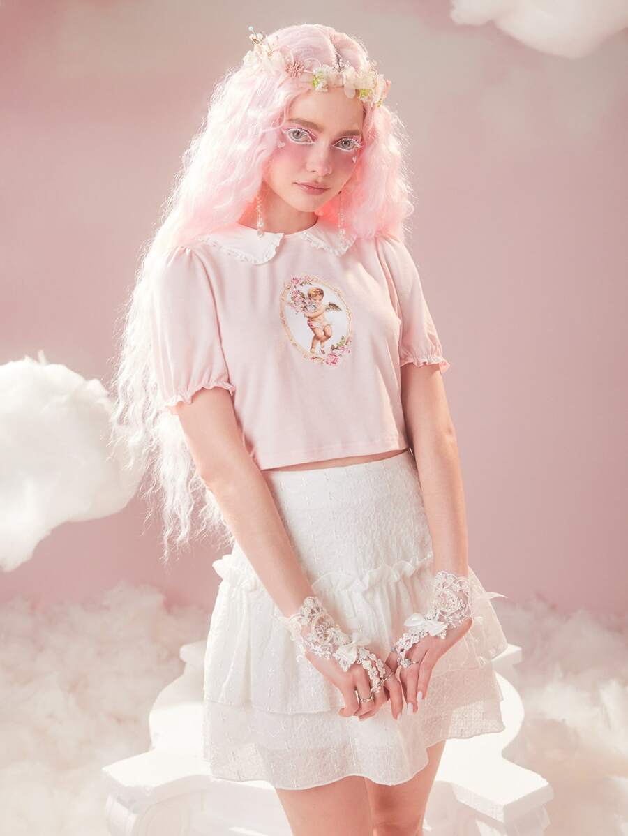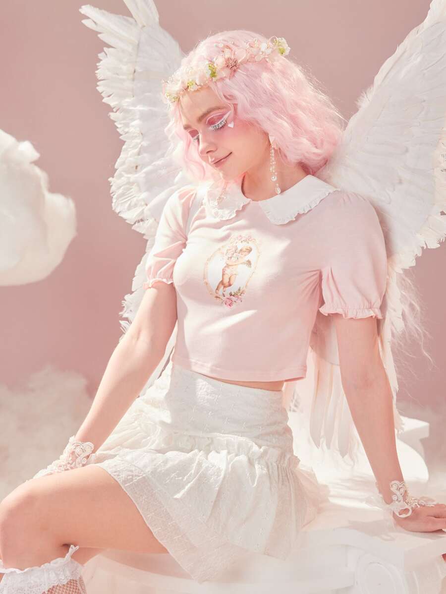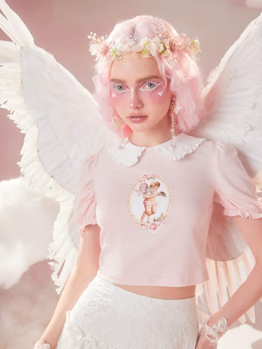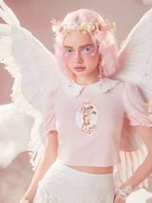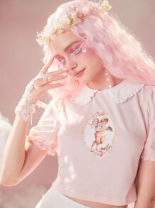 Camiseta De Manga Con Globo De Cuello De Contraste Con Gráfico De Ángel