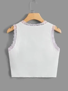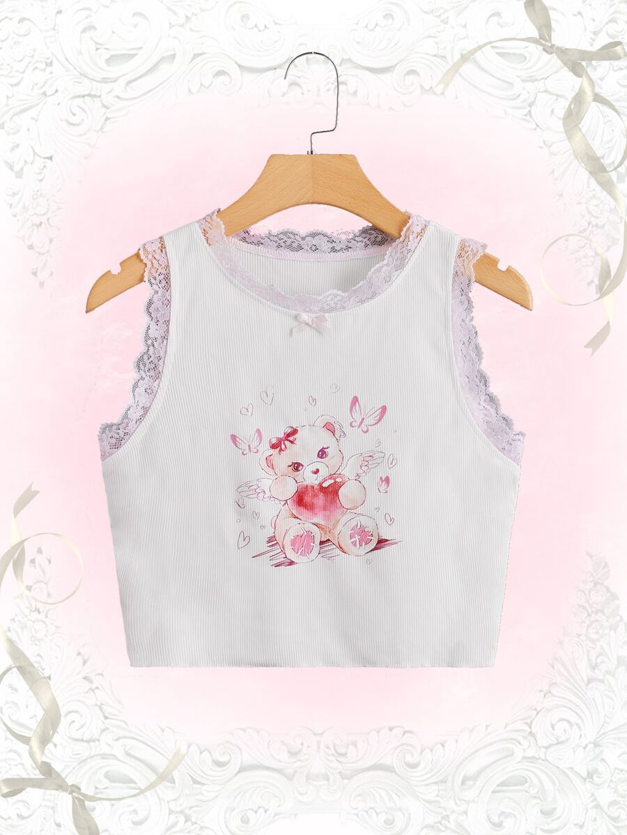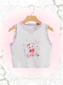 Top tank oso de dibujos animados & con estampado de mariposa con encaje en contraste de canalé