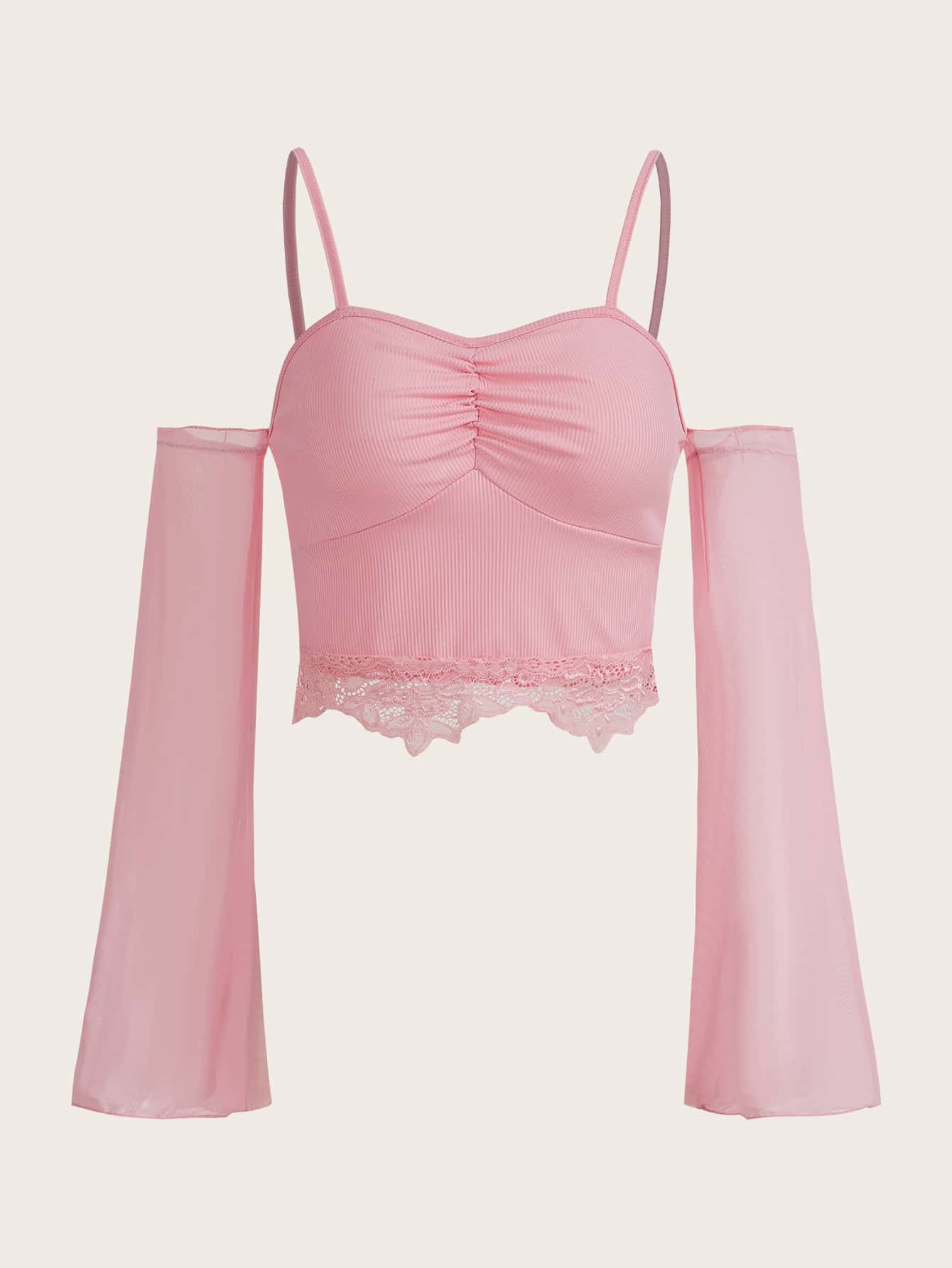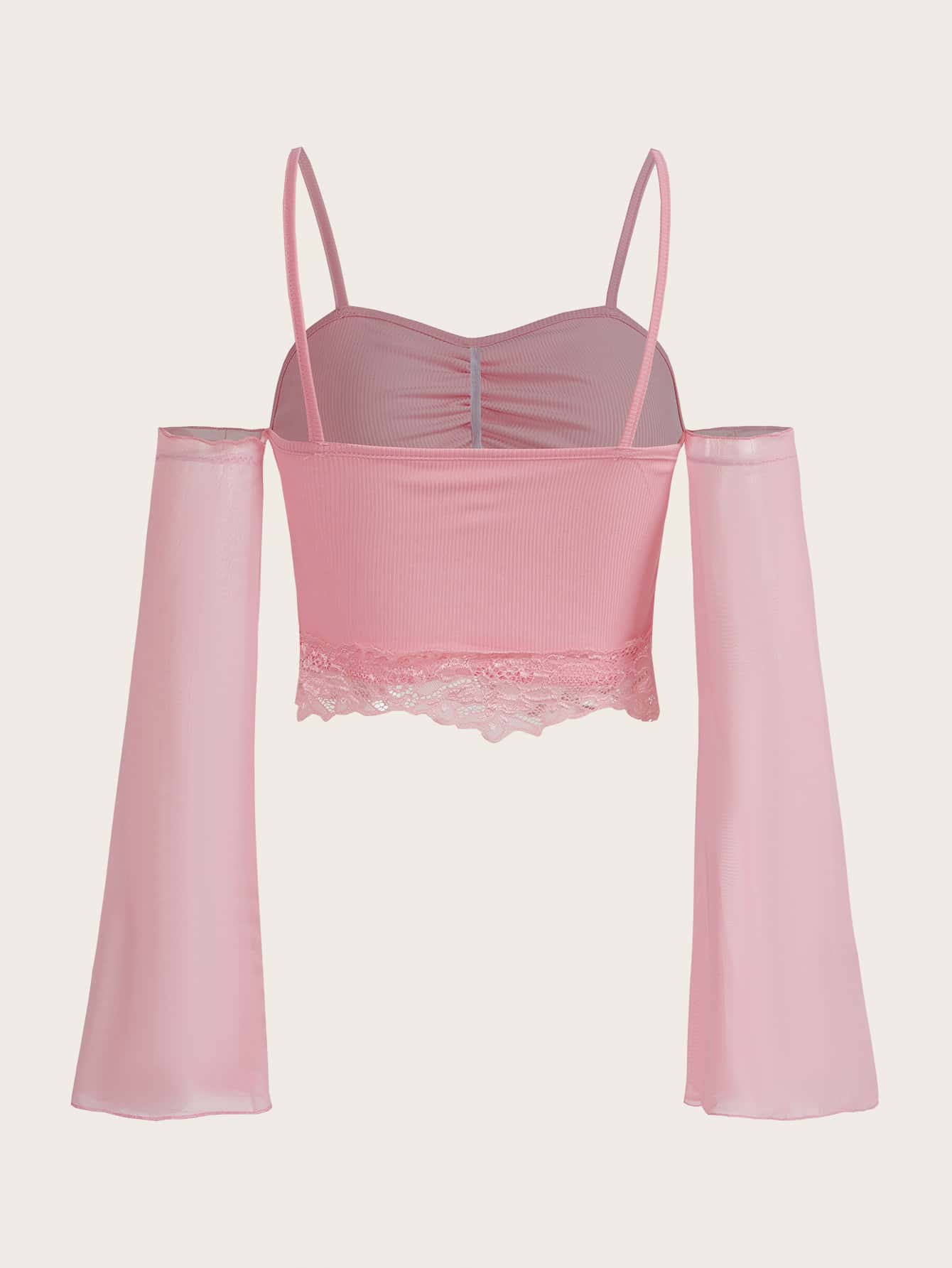 Sweetness Top crop con encaje en contraste de hombros descubiertos fruncido