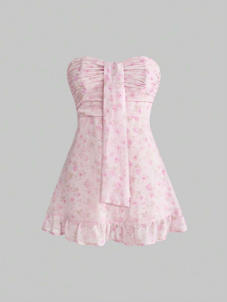 Sweetness Vestido corto de gasa con estampado floral sin tirantes, romántico y dulce, adecuado para vacaciones