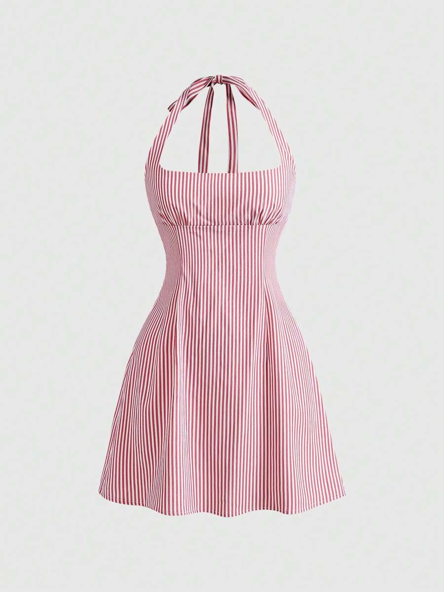 Sweetness Vestido mini ajustado con tirantes halter y espalda descubierta a rayas, estilo dulce de vacaciones