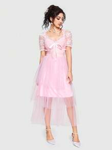Sweetness Vestido de princesa de malla de encaje con contraste rosa dulce para mujer