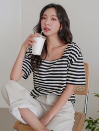 Camiseta De Manga Corta Con Cuello Asimétrico Y Bordado De Luna Y Rayas Para Mujeres