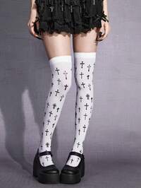 Grunge Punk 1 par de calcetines sobre la rodilla con estampado de cruz y cadena de color contrastante en estilo punk, calcetines de cosplay de anime para mujeres