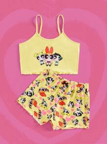 The Powerpuff Girls | ROMWE 2 piezas Conjunto de pijama con parte superior tipo camiseta con estampado de dibujos animados lindos y shorts con ribete de lechuga, para verano