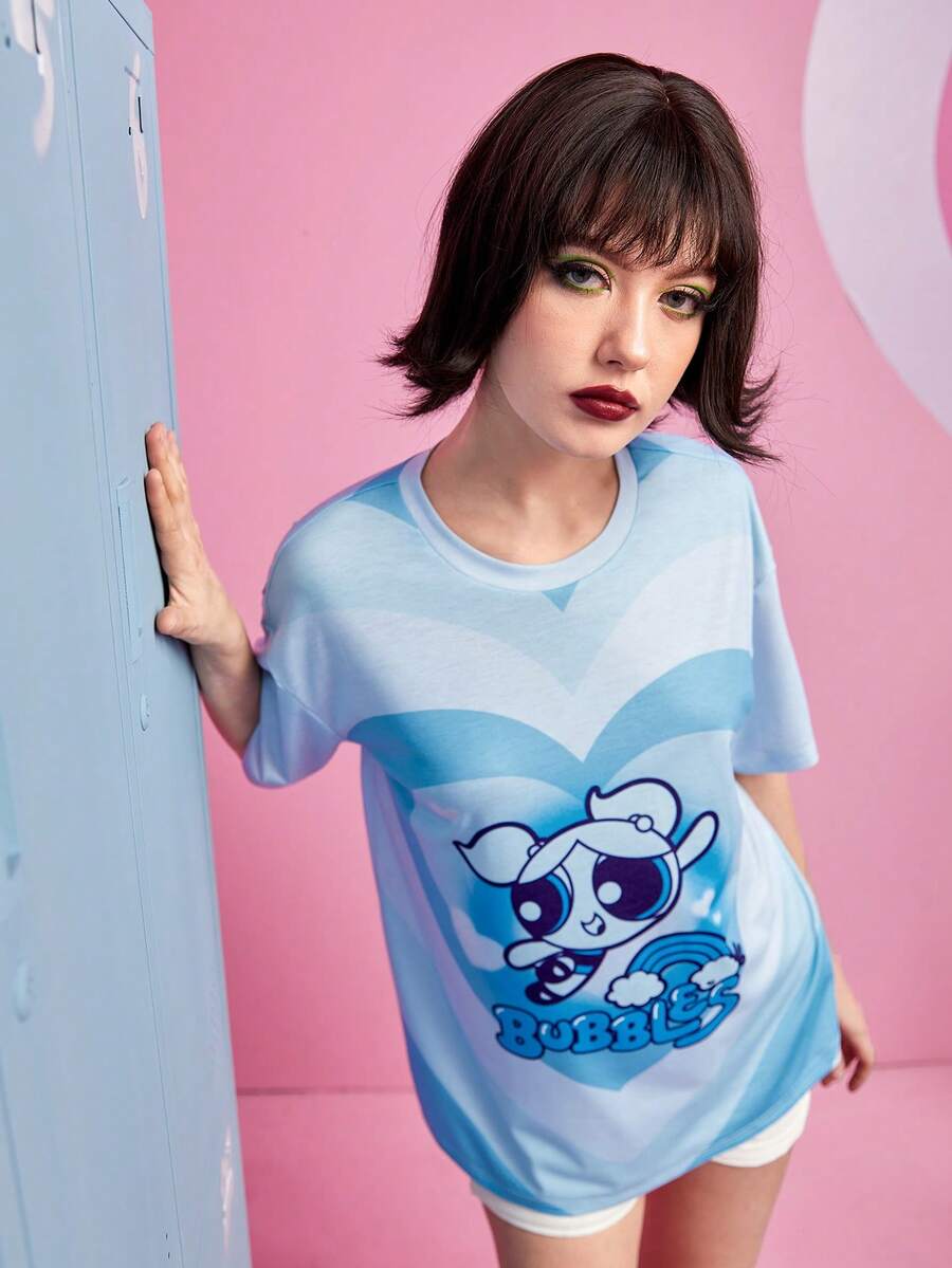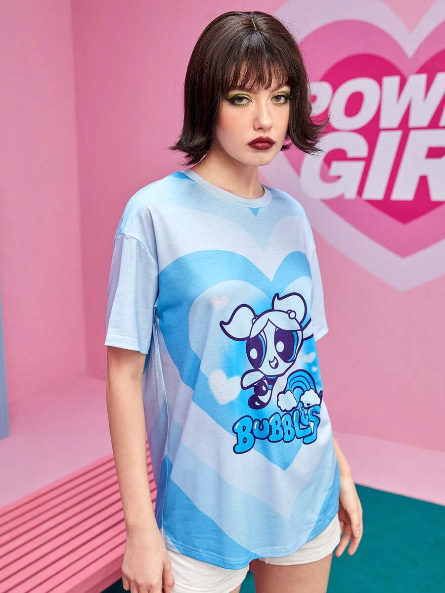 The Powerpuff Girls | ROMWE Camiseta de hombros caídos con estampado de corazón y dibujos animados