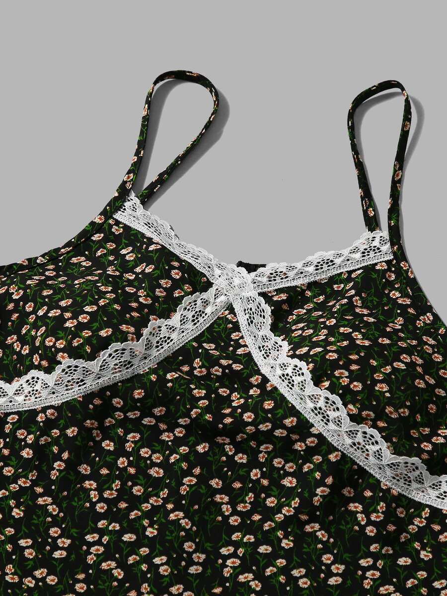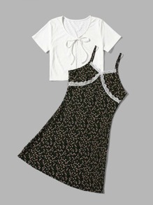 con cordón delantero Top & con encaje en contraste floral Vestido