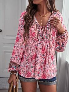 Camisa babydoll con estampado floral de cuello con cordón