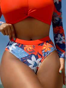 Conjunto de tankini con estampado tropical Manga larga con cordones en la espalda Camiseta de cuello alto y parte inferior de talle alto Traje de baño de 2 piezas