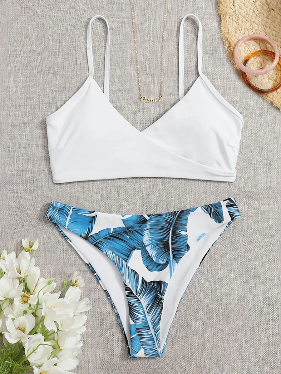 Conjunto de bikini con camiseta sin mangas de estilo envolvente tropical para playa de verano
