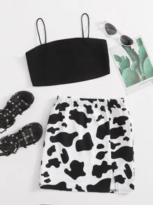 Conjunto De Top Tipo Cami Sólido Y Falda Con Diseño De Vaca Para Niña Pre-adolescente