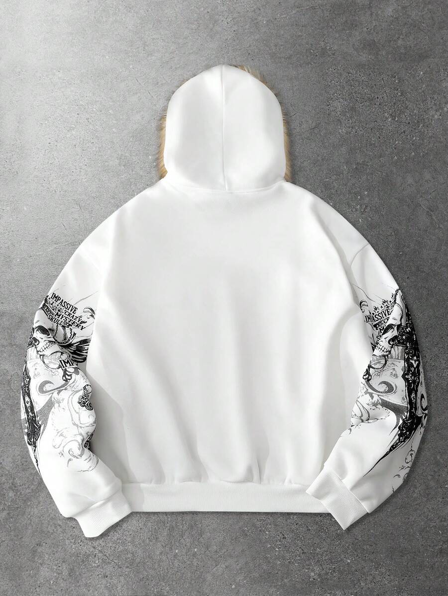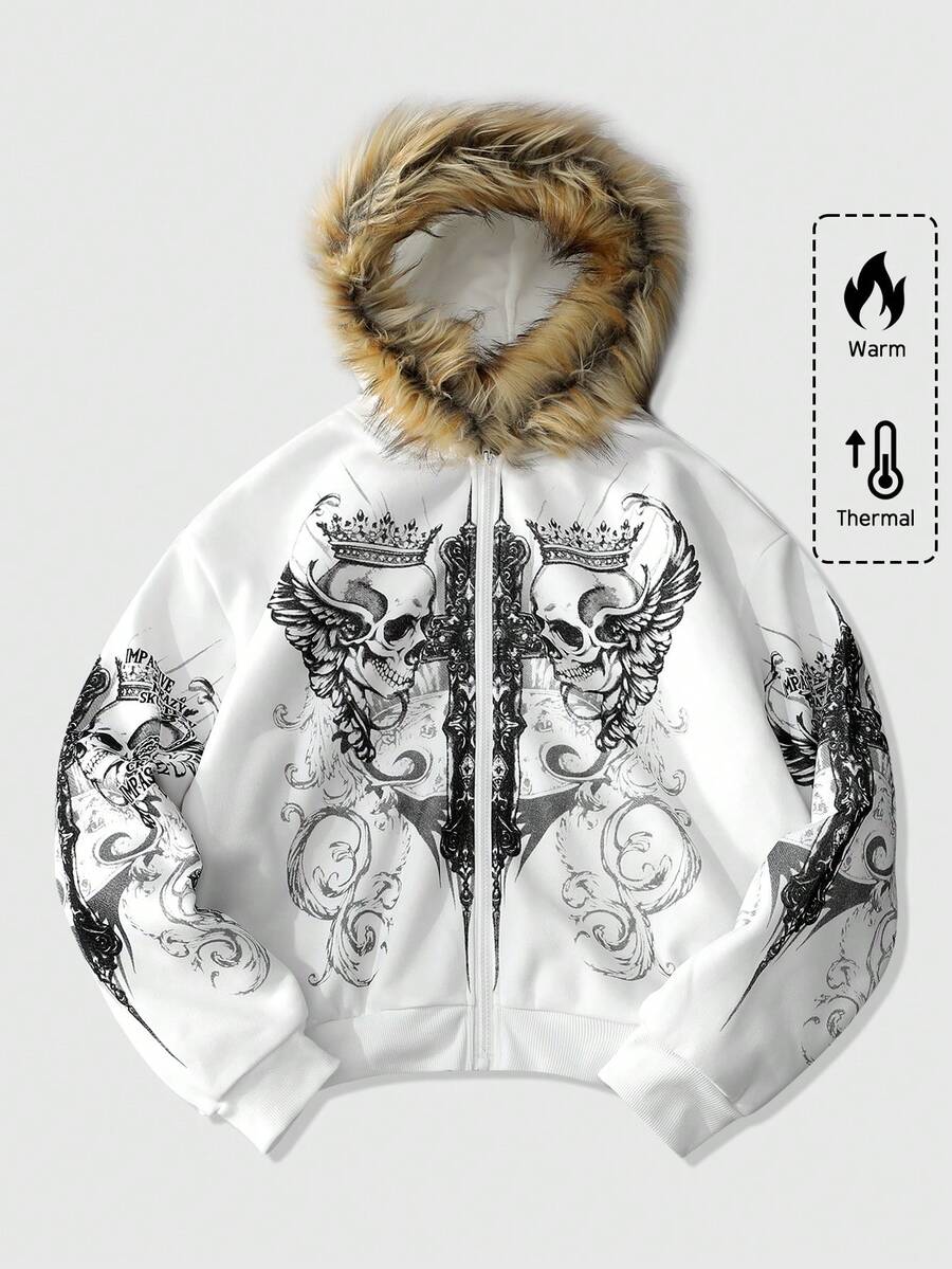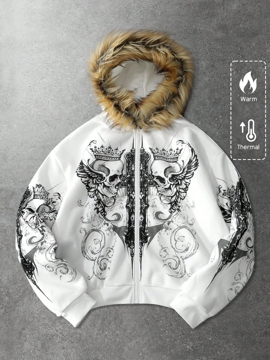 Sudadera con capucha unisex con estampado en inglés y cuello de piel, para otoño/invierno