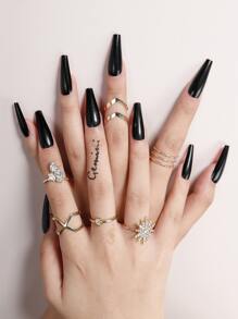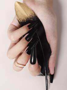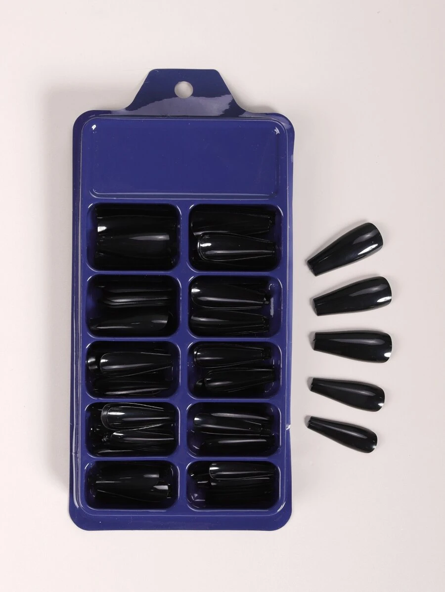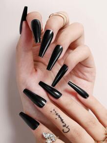 Mejora tu apariencia con 100 uñas postizas largas en forma de ataúd, de color negro liso y brillante. Suministros para uñas