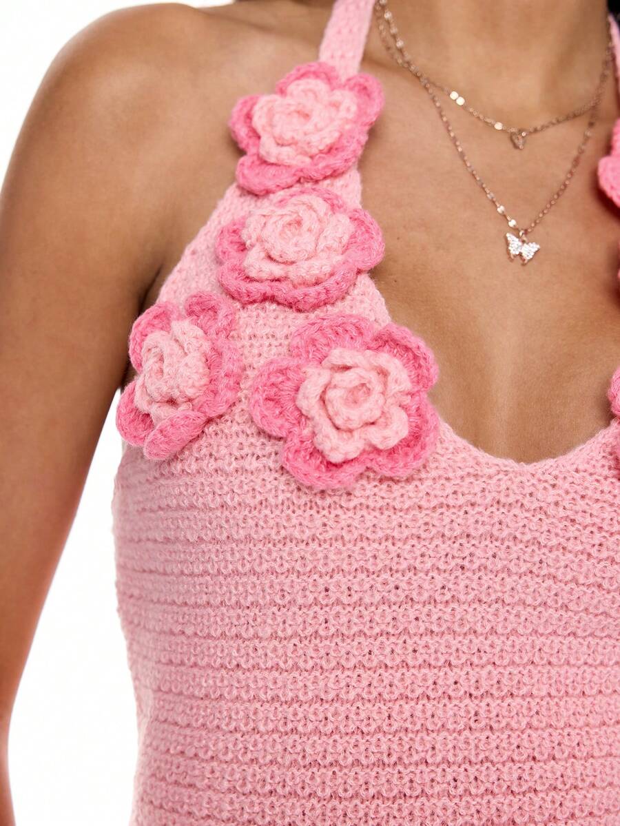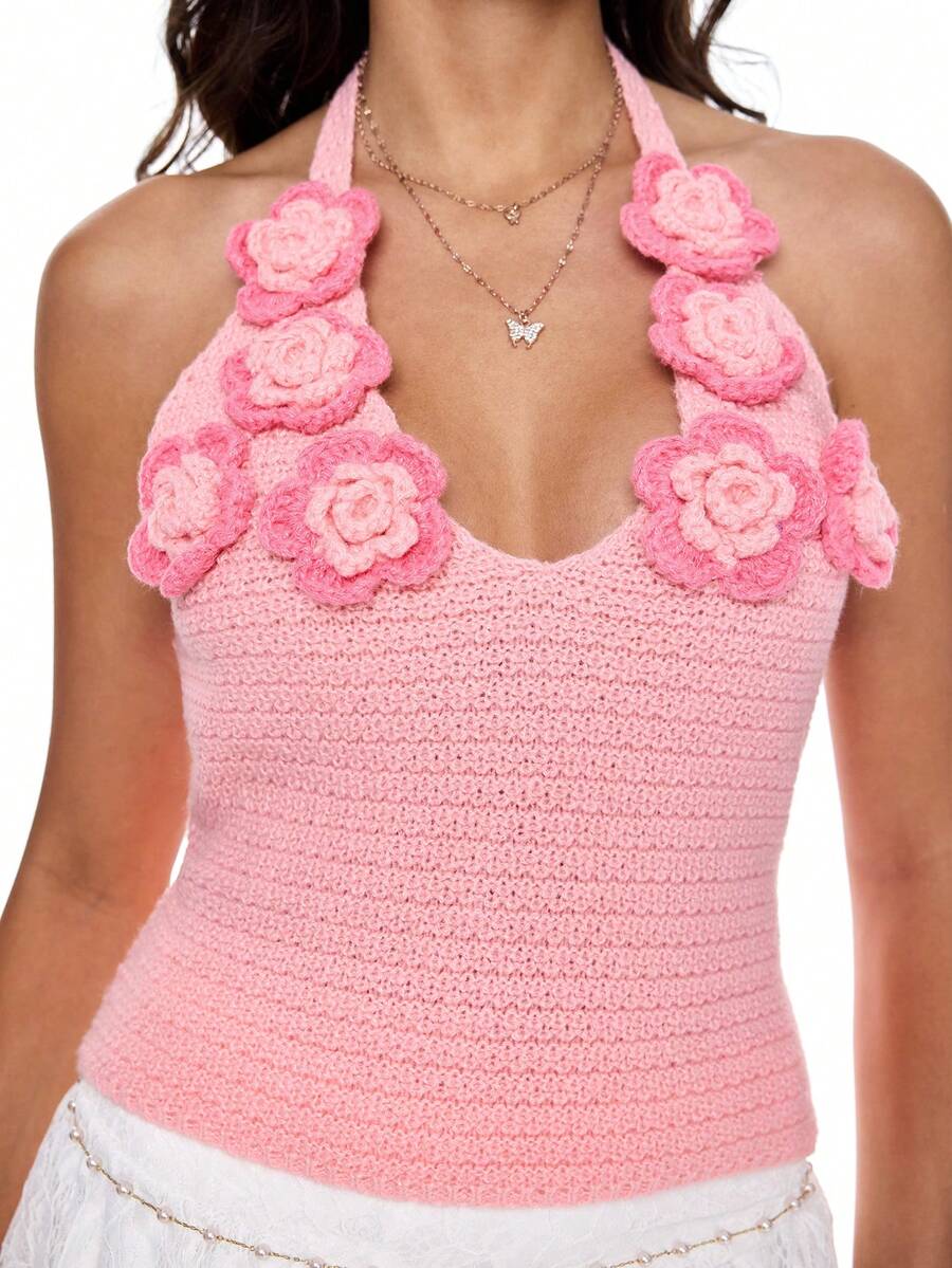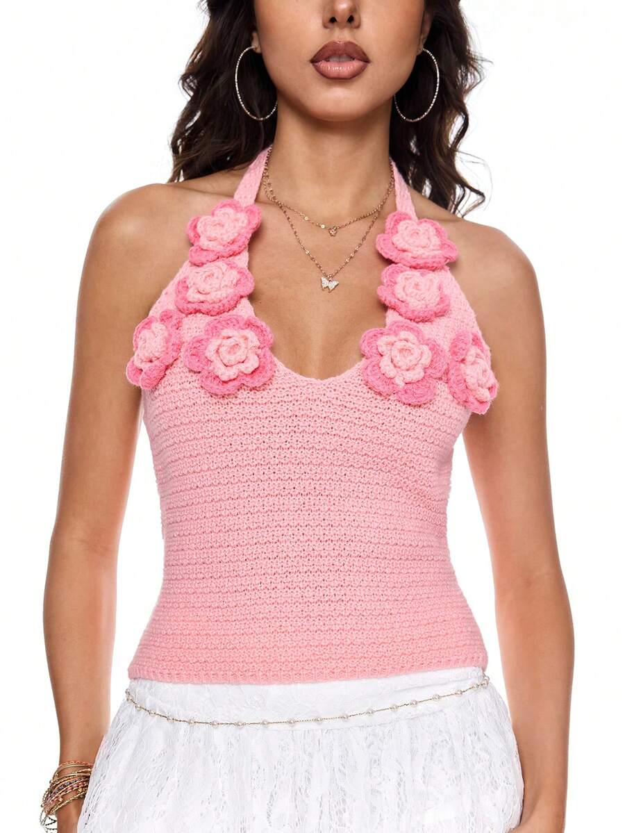 Kawaii Top tejido de cuello halter ceñido con flores 3D para mujeres, ideal para vacaciones