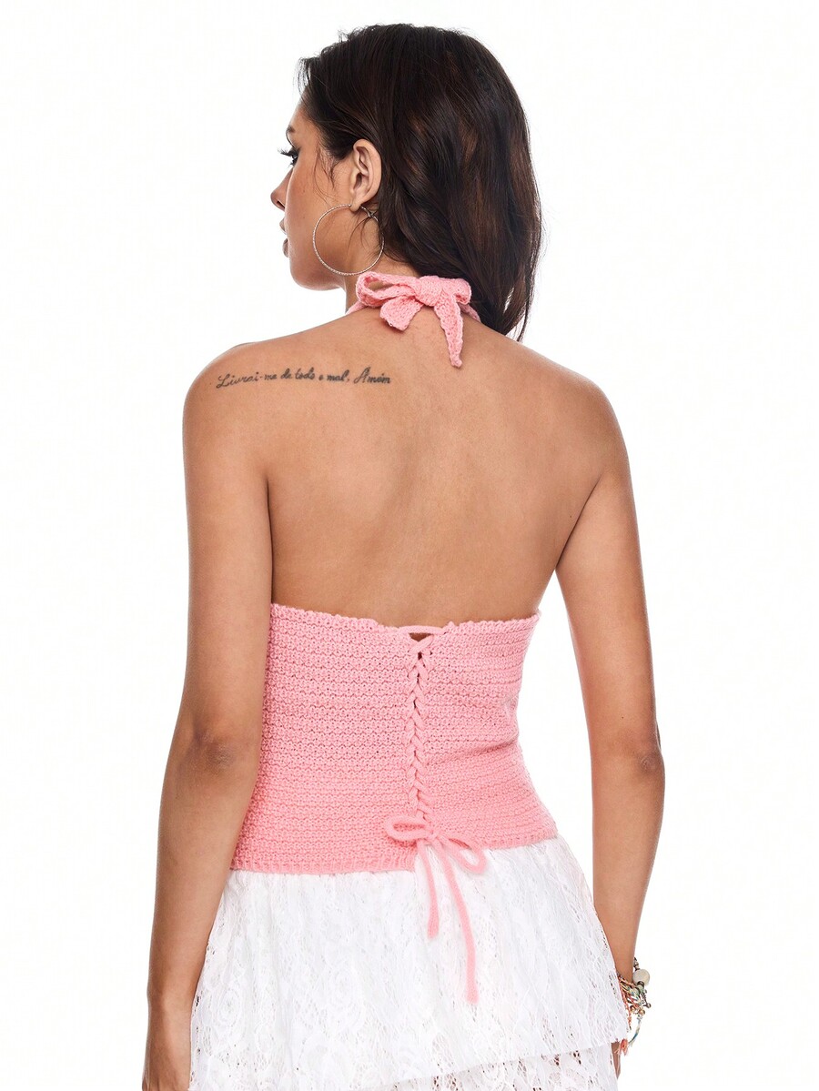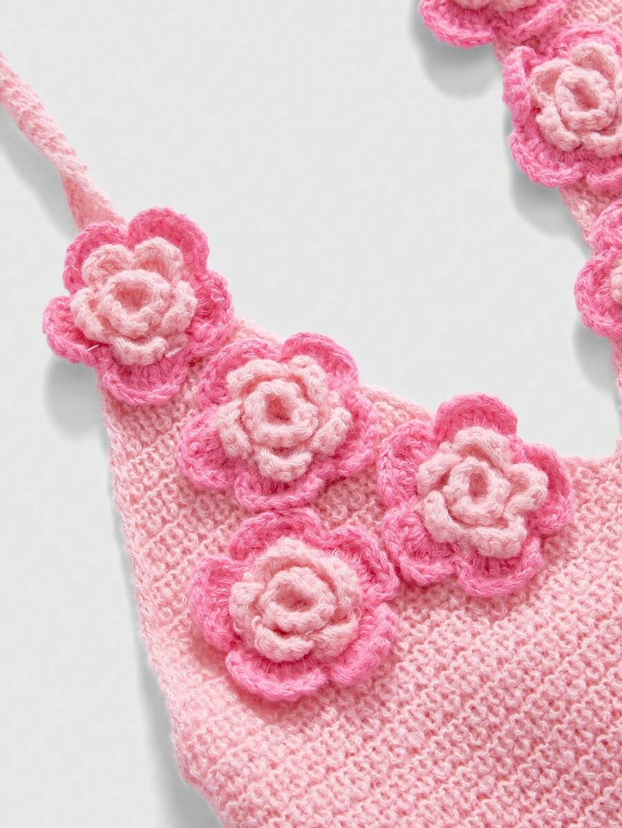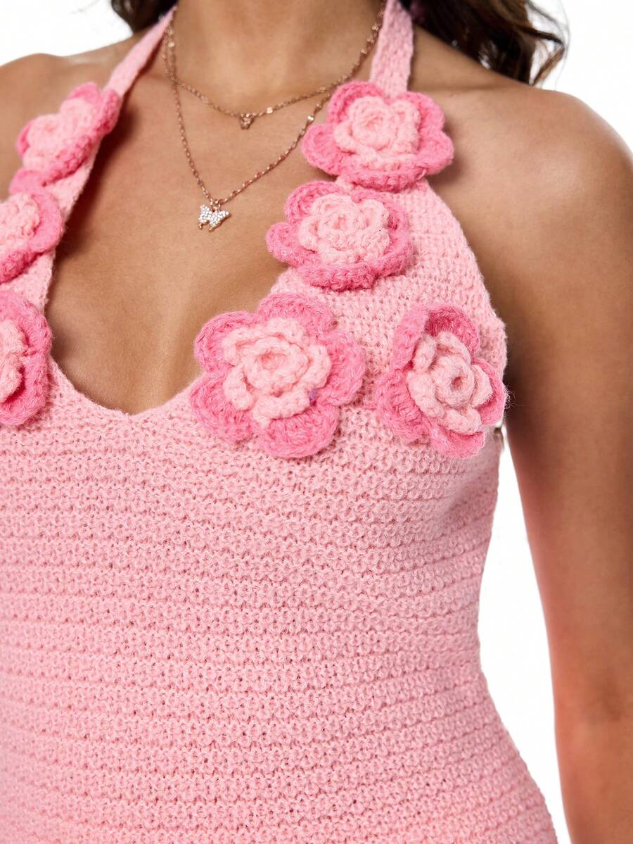 Kawaii Top tejido de cuello halter ceñido con flores 3D para mujeres, ideal para vacaciones