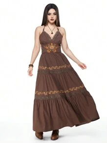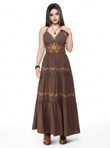 Hippie Vestido midi retro de estilo occidental con bordado floral de inspiración vintage de los 90, adecuado para principios de otoño