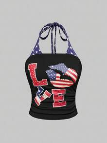 ROMWE Avant Top sin tirantes con volantes y estampado de conchas marinas, bandera estadounidense y lápiz labial, estilo callejero estadounidense vintage