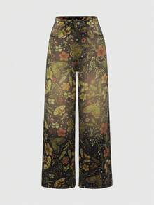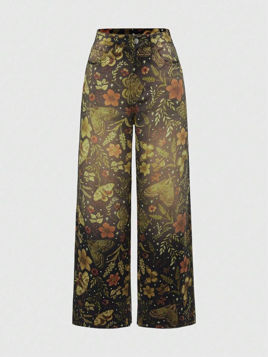 Fairycore Jeans anchos de pierna ancha con lavado y estampado floral vintage para mujer