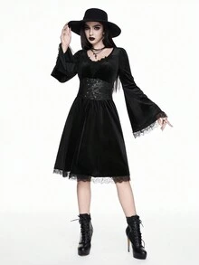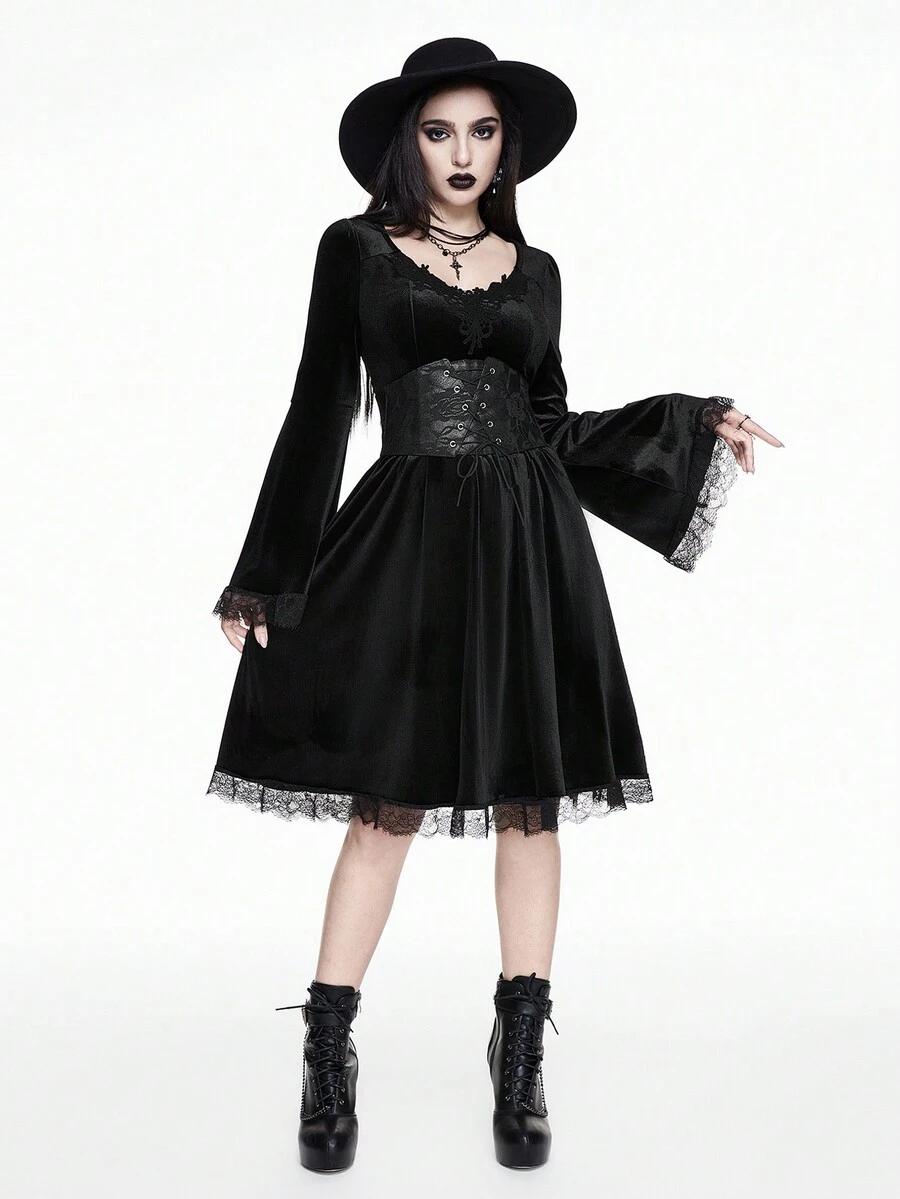 Goth Vestido elegante de fiesta vintage gótico para mujer, con escote profundo, transparente, con volantes y detalles de encaje, y mangas trompeta