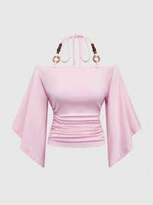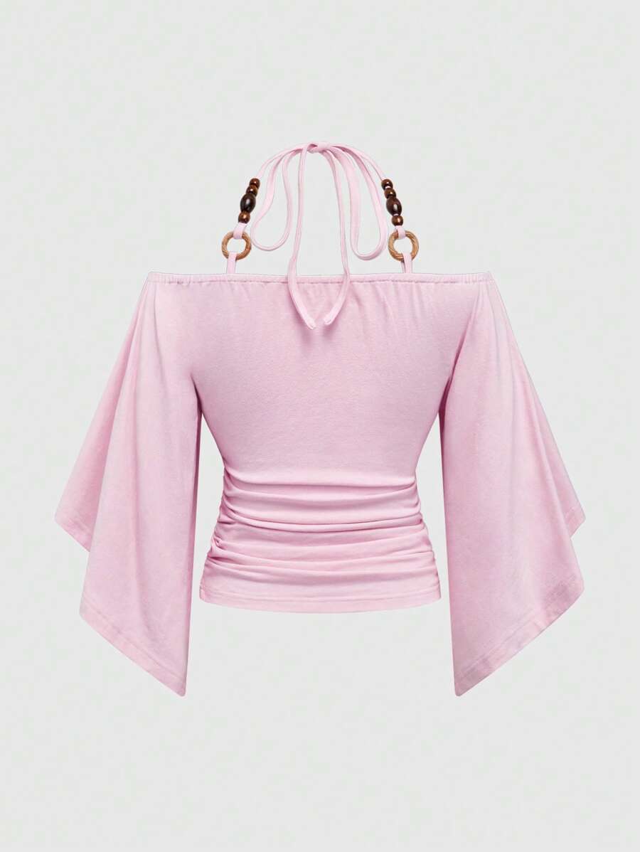 Hippie Blusa de mujer de manga murciélago holgada y con escote caído con decoración de cuentas de madera vintage