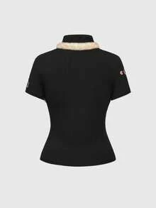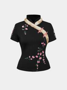 Camiseta de mujer de corte ajustado con cuello Mao, bordado floral y aplicación de piel, en estilo vintage chino