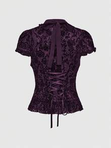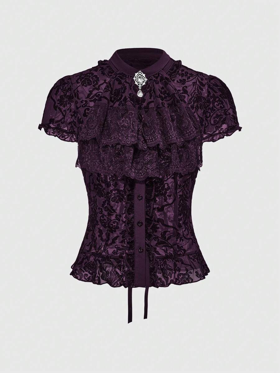 Blusa de mujer con cuello de volantes desmontable estilo gótico palaciego con estampado, colgante de cristal barroco, mangas de volantes y lazo en la cintura
