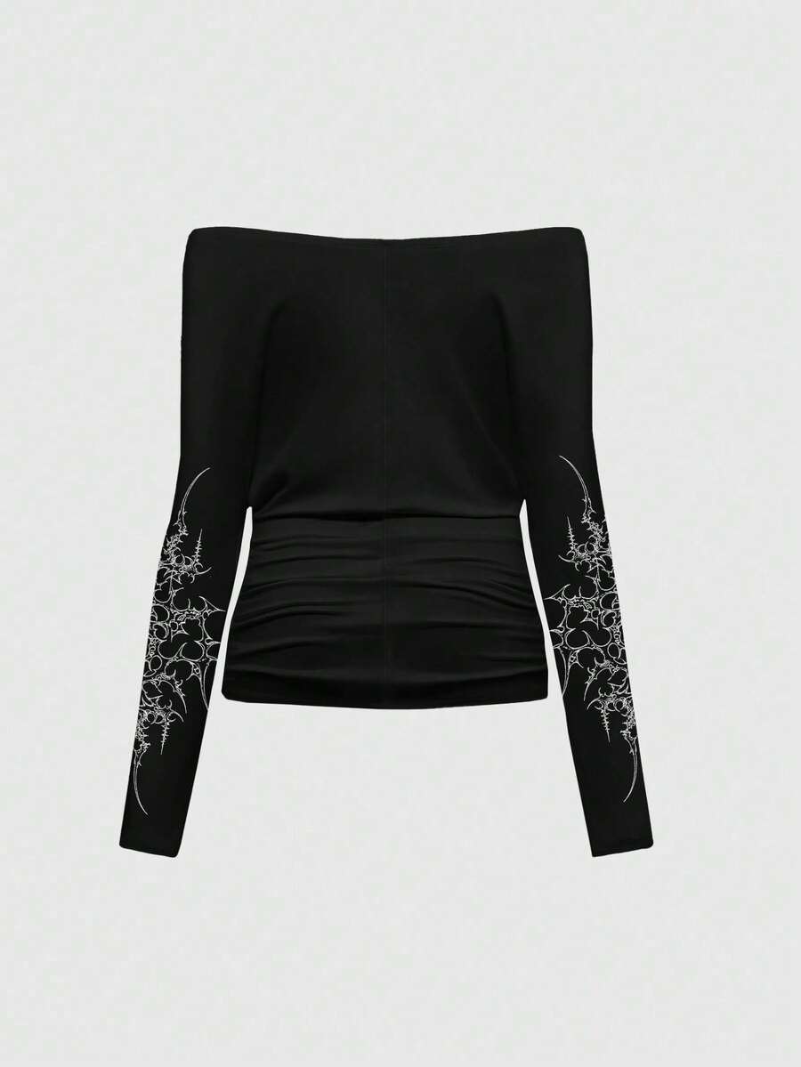 Grunge Punk Camiseta larga de mujer con estampado, de manga larga, con hombros descubiertos, fruncida y holgada, con estilo sexy Y2K