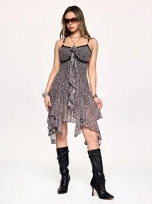 Grunge Punk Vestido mini asimétrico para mujer con combinación de leopardo, tul y encaje vintage