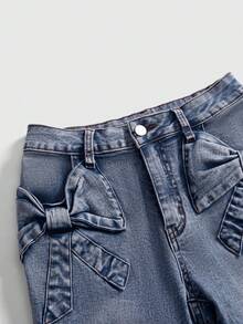 Kawaii Vaqueros de pierna acampanada de tiro bajo con parche de mariposa desgastado en lavado vintage azul