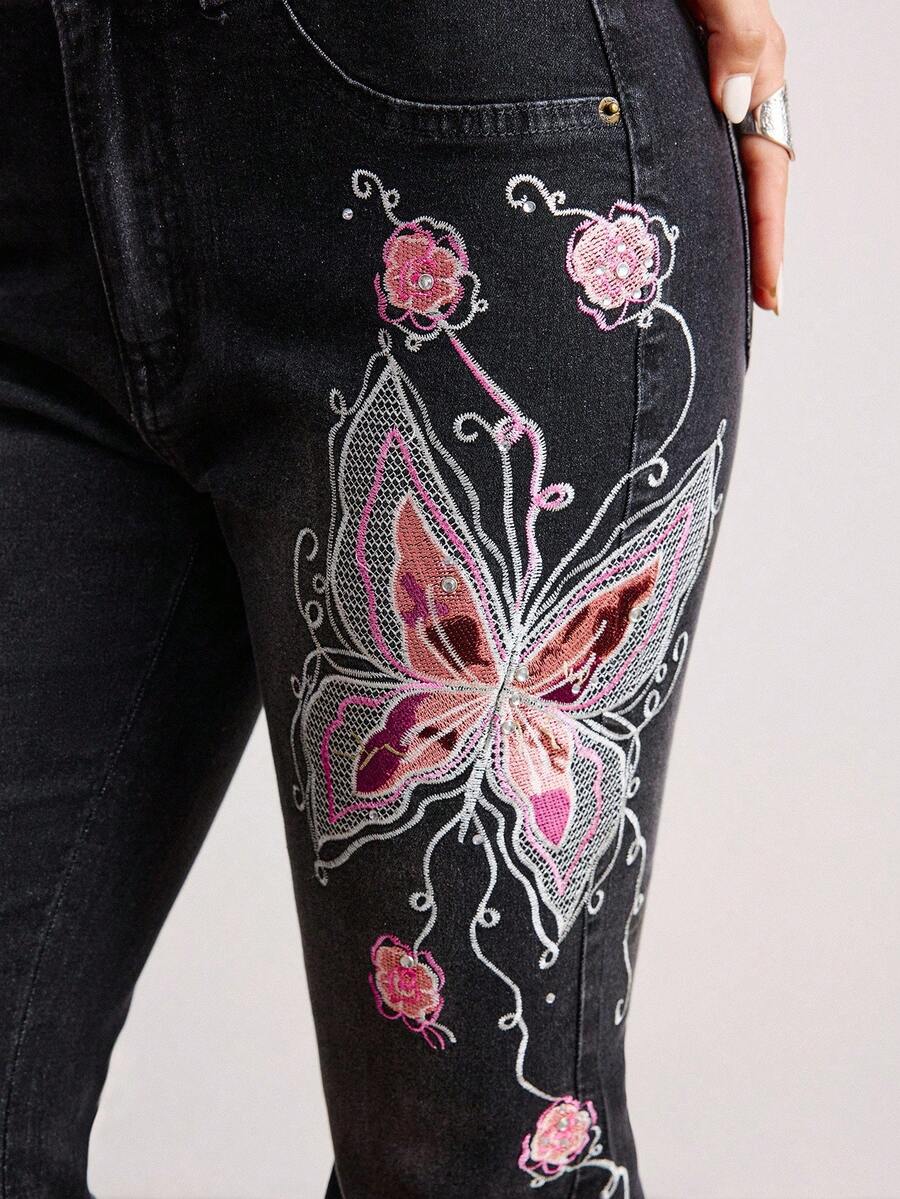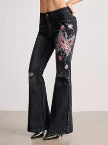 Goth Jeans de tiro bajo y acampanados con bordado jacquard de mariposas y rosas, estilo vintage Y2K para mujer