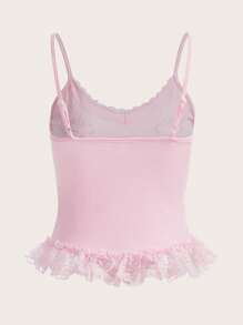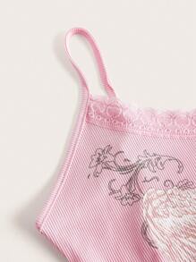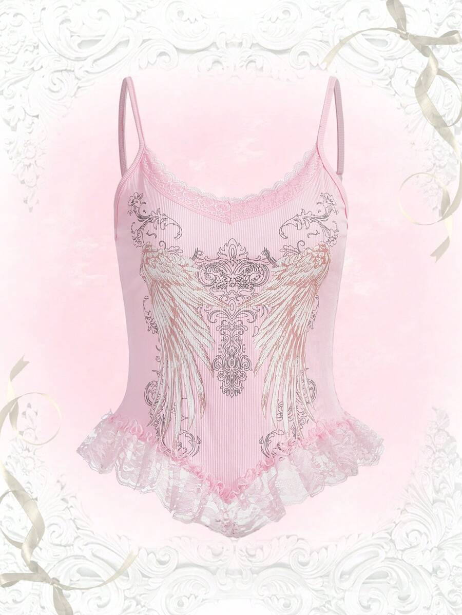Kawaii Top de tirantes ala con estampado con encaje en contraste