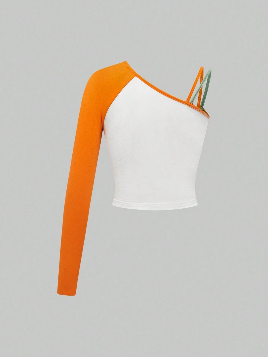 Winx Club X ROMWE Camiseta corta ajustada con estampado de dibujos animados, manga raglán, hombro asimétrico y bloqueo de color para mujer